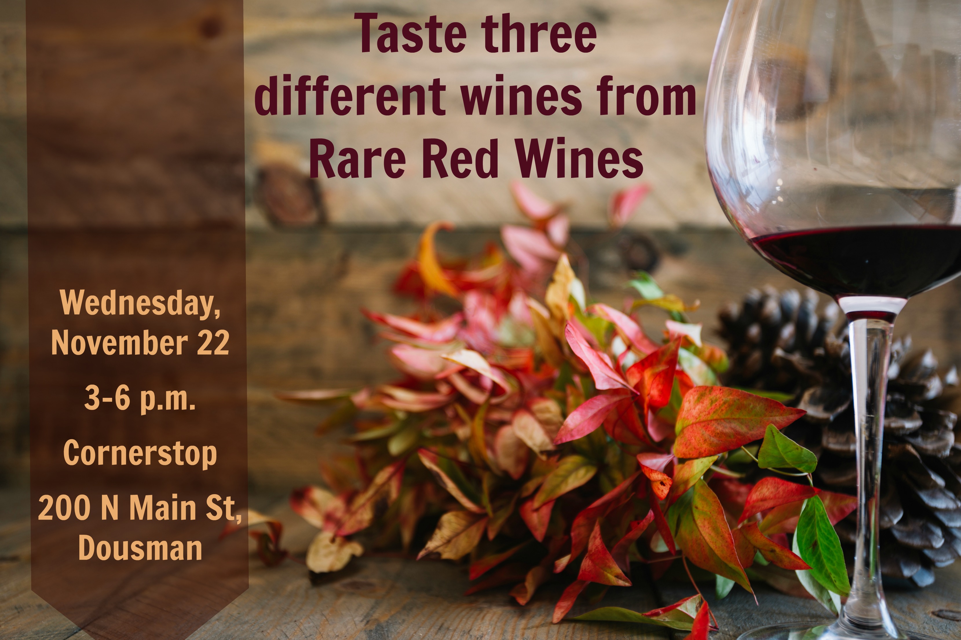 The evening begins at Dousman Elementary (Hwy 67 South to Hwy Z: 341 E Ottawa Ave, Dousman) where a FREE shuttle bus takes you to and from Three Pillars. The first bus loads and leaves the school at 6 PM; doors open at Three Pillars at 6:30 PM. The last bus will leave the school to head to Three Pillars at 7:45 PM. There is no parking available at Three Pillars for this event.