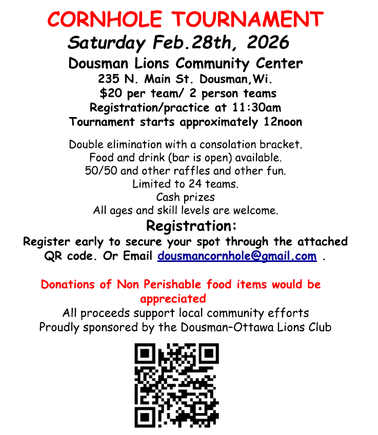 Calendar Add to Calendar Add to Timely Calendar Add to Google Add to Outlook Add to Apple Calendar Add to other calendar Export to XML When: February 28, 2026 @ 12:00 pm – 4:00 pm 2026-02-28T12:00:00-06:00 2026-02-28T16:00:00-06:00 Where: Dousman-Ottawa Lions' Club 235 N Main Street Dousman Cost: 20 Contact: Dousman-Ottawa Lions Club (414) 406-1915 Email Event by Chamber Member Family Friendly