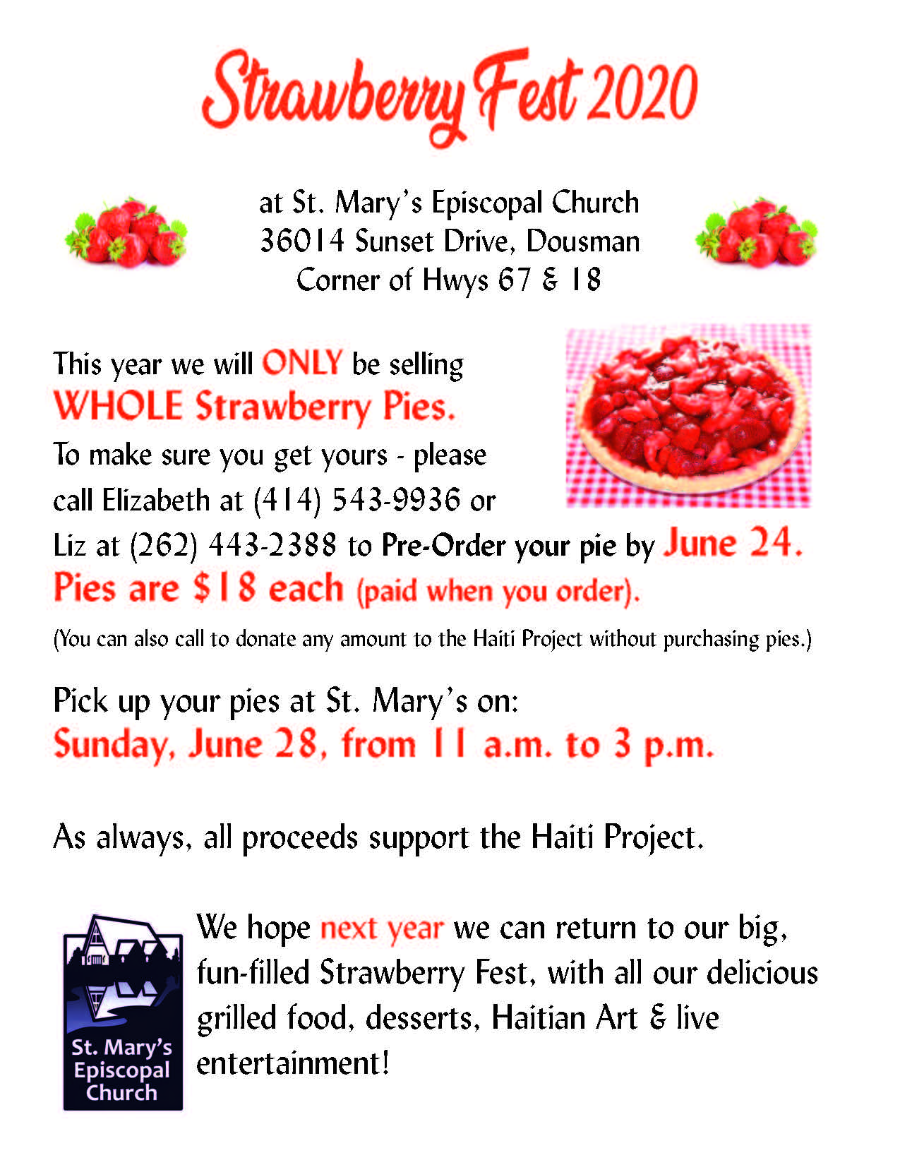 Calendar Add to Calendar Add to Timely Calendar Add to Google Add to Outlook Add to Apple Calendar Add to other calendar Export to XML When: June 24, 2020 all-day 2020-06-24T00:00:00-05:00 2020-06-25T00:00:00-05:00 Where: St. Mary's Episcopal Church 36014 Sunset Drive Dousman WI 53118 Contact: Elizabeth 414.543.9936 Event by Chamber Member